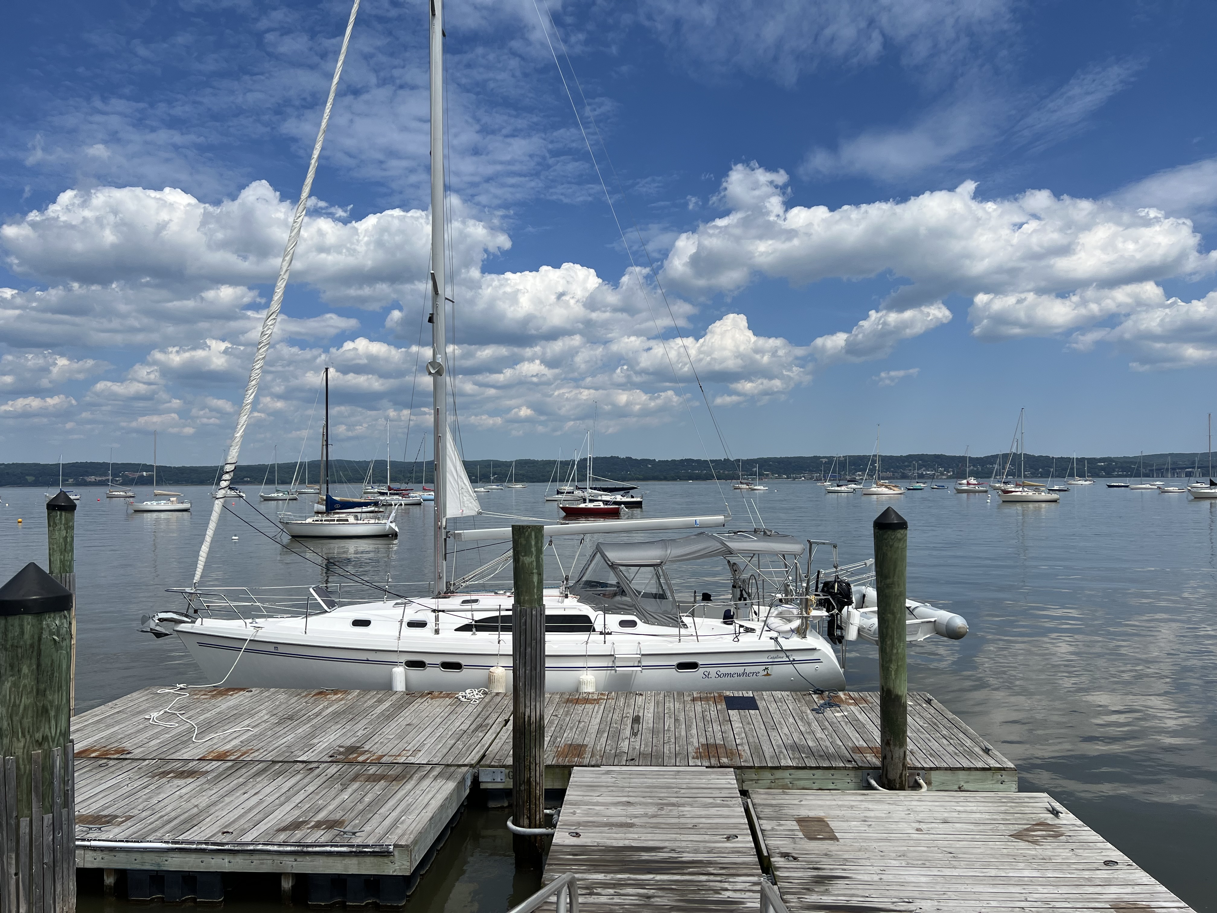 St. Somewhere is a well-maintained 2004 Catalina 387 sloop hailing from Oxford, Maryland, offering the comfort and capability that have made this model a respected choice among bluewater cruisers and coastal sailors alike. Built on a fiberglass hull measuring 38 feet 9 inches LOA with a 13-foot 3-inch beam, she carries a shoal draft wing keel drawing just 5 feet, opening up a wide range of anchorages along the Chesapeake and beyond. Her 16,500 lb displacement and 6,200 lb of ballast deliver a ballast ratio near 37%, providing confident, stable sailing. Power comes from a Yanmar 3JH4E three-cylinder inboard diesel delivering 29 hp through a shaft drive turning a Variprop three-blade folding propeller — a performance-oriented choice that minimizes drag under sail. Upwind sail area of approximately 760 square feet is set on a sloop rig with an in-mast furling mainsail replaced in 2020, a brand-new 2026 roller-furling jib, and standing rigging replaced in 2022, giving the next owner a sailplan that is essentially turnkey. The single folding helm wheel sits in a large, well-protected cockpit fitted with a hard-framed dodger, a bimini top, a full cockpit enclosure in dark gray canvas, and a stainless steel arch — making St. Somewhere a genuinely comfortable offshore watch platform in any conditions. A walk-through transom leads to the swim platform, and a bow windlass with plow anchor handles ground tackle duties up front. Below, the teak and holly sole, warm teak cabinetry with louvered doors, and white/cream upholstery in good condition create a bright, classic interior. The galley is laid out with a gimbaled propane stove and oven, a double stainless sink, and ample counter and cabinet space. Three interchangeable dining tables are included. The dedicated navigation station to starboard features a full electrical panel and chartplotter with integrated AIS. With 3 water tanks totaling approximately 80 gallons and a 42-gallon fuel tank, her range and self-sufficiency are well-suited to extended coastal passages. Sleeping accommodations are arranged across two private cabins plus the main saloon, accommodating seven in total. The forward V-berth cabin and the private aft owner's cabin — fitted with a mattress replaced in 2022 — each provide genuine privacy, while opposing saloon settees handle additional guests. Two heads serve the boat. The headliner, cushions, woodwork, and gelcoat are all in good condition, and the overall presentation reflects a boat that has been cared for and thoughtfully upgraded. St. Somewhere is ready to sail.